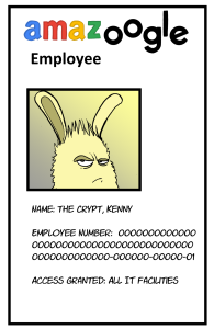 In a related story (quite literally!), Amazoogle has hired Kenny the Crypt of the Dust Bunny Mafia. Just to prove it, here is Kenny’s recently issued badge: