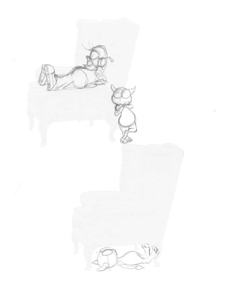 The next sketch was also ran through a Photoshop filter, but in the opposite direction. The wingback chair drawing was scanned in and lightened until it was barely visible and then printed out on paper so that I could draw Elmo and Lucas in the proper poses. Getting Elmo in that brooding pose was something that I didn’t think that I could eyeball correctly.