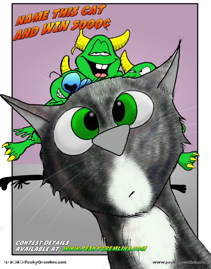 Once again here are the Name the Cat Contest details! WIN: 5000 cents! * A Pesky Gremlins Cartoon of your choosing printed on canvas (the perfect gift for an annoying relative!) *For those bad with decimal points and currency exchange rates, 5000 cents = $50 U.S. Dollars How to enter: It couldn’t be easier! Using your favorite communication method, just send me the suggested cat name. The cat names will be entered on a first come first serve basis. Enter as many names and times as you like. I will post the names that I receive on the website so everyone can see. I should point out that the following communications method will likely be successful: Comment on the Pesky Gremlins Website (just scroll down) Email: hstacymail@gmail.com Send me a comment or personal message on Twitter: @PeskyGremlins Send me a message on Facebook: Elmo Glitch Note that the following communications methods will likely be Unsuccessful: Phone Calls – leave a message Smoke Signals Telegram Telepathy Pony Express Results will be announced on Monday, June 8. …And here are the current Cat Name Entries: Flicker Rocket Turbo Gyro Tango Gizmo Cat Dog Heyyou Corona Trouble Possum Vermin Lucky Jinx Tuxensocks Tux Ziggy Stardust Merlin Deku Felix Fred Gato Ivan Fe-rex Fedora Pest Patches Gears Baron Voodoo Katnip Tuxedo Furball LeCat Bootsy Daedrax the Eater of Souls Emerald Toes McGee Tuna Breath Catacus Rats Catnip Catacus Ratacus Catsup Catapult Catastrophe Hairball Road Pizzia …to be continued Thanks for all of your great cat names and keep them coming!