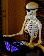 Just for fun, here is a picture of the plastic glow-in-the-dark skeleton that inspired the cartoon character. This picture shows Slim at the computer seeing himself as a cartoon for the first time.