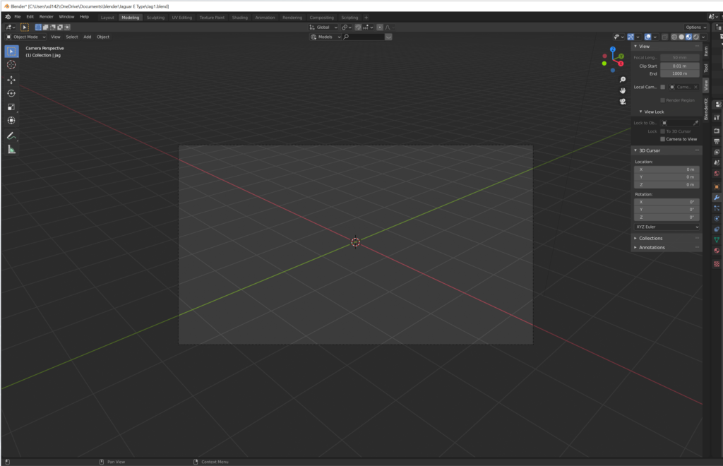 I made my purchase and downloaded the model and was most unpleasantly surprised to see that the model was NOT in the format that I expect or needed. I was certain that I was not the first person to run into this kind of problem and a little googling revealed a free website that could make the necessary file conversion. I was a little skeptical as to whether this conversion would work or not but I had nothing to lose by trying. The process appeared to work. I loaded the results into Blender and this is what I saw. You might have noticed the complete lack of a Jaguar model as I did. After all, I had spent $4 for a Jaguar model. You can imagine my disappointment. But all was not lost. There was a model there. By a fluke of some sort, the model was just floating in space and needed to be brought into view. Here is what it looked like once it was reeled back into the viewport. jaguar E-type  xke model There are some obvious and less obvious problems with the car, but overall, it was a good starting point. The obvious problems were that it was still oriented oddly and had a giant piece of something attached as some sort of base. Less obvious was the fact it was all a single model with lots of polygons (in other words it gobbled up LOTS of memory) and had absolutely nothing painted. Finally, the interior was from an older model of Jaguar and would need updating or outright replacing. I felt confident that I could make all of these changes, but they would be time consuming.